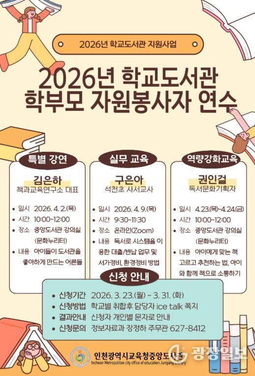 광장일보 주재영 기자 | 인천광역시교육청중앙도서관은 학교도서관 학부모 자원봉사자들의 전문성을 높이고 자녀와의 소통 능력을 함양하기 위해 ‘2026년 학교도서관 학부모 자원봉사자 연수’를 운영한다.