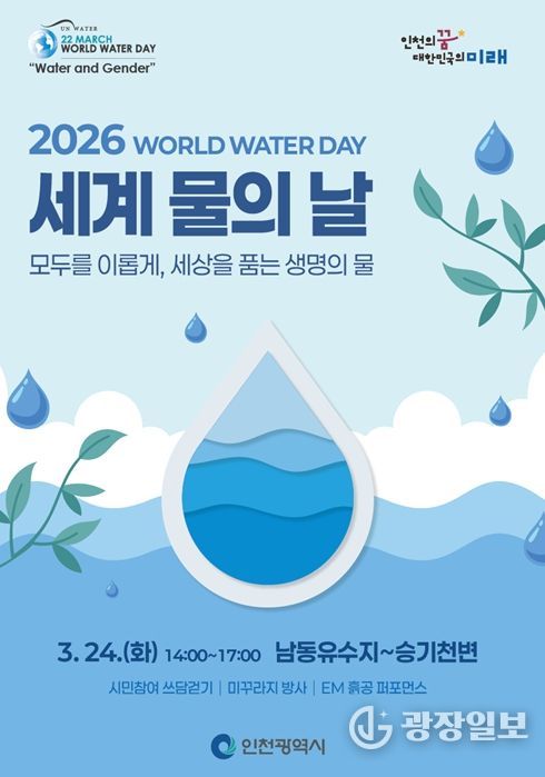 광장일보 주재영 기자 | 인천광역시가 24일 남동유수지 일원에서‘2026년 세계 물의 날’을 기념해 시민들과 함께 발로 뛰는 환경정화 캠페인‘쓰담걷기(플로깅)’행사를 개최했다.