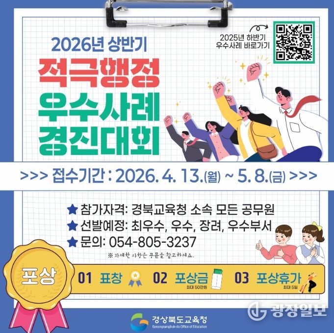 광장일보 주재영 기자 | 경북교육청은 능동적이고 창의적인 공직문화를 조성하고 교육 현장의 변화를 이끈 우수 사례를 발굴하기 위해 ‘2026년 상반기 적극행정 우수 사례 경진대회’를 개최한다고 15일 밝혔다.