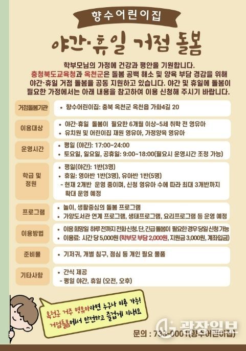 군은 충청북도교육청과 협력해 향수어린이집을 거점기관으로 지정하고, 기존 보육 시간대의 공백이었던 평일 야간과 주말·공휴일 돌봄 체계를 본격 운영하고 있다고 밝혔다.