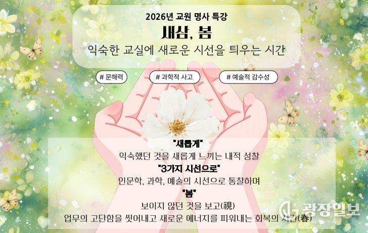 광장일보 주재영 기자 | 부산광역시교육청교육연수원은 오는 21일부터 6월 2일까지 3회에 걸쳐 연수원 대강당에서 교원 및 교육전문직원 400여 명을 대상으로 2026 명사 초청 특강 ‘새삼 봄’을 운영한다.