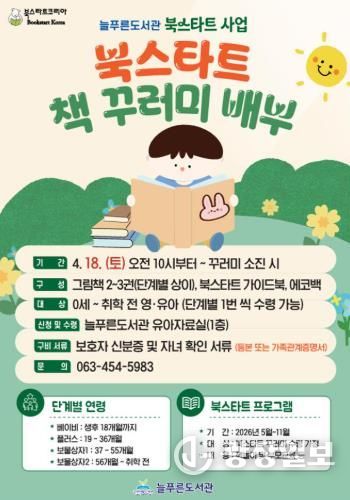 북스타트 꾸러미 신청 및 수령은 4월 18일부터 늘푸른도서관 1층 유아자료실에서 가능하며, 보호자 신분증과 자녀 확인이 가능한 등본 또는 가족관계증명서를 지참하여 현장에서 수령할 수 있다.