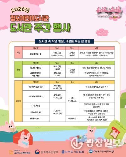 광장일보 주재영 기자 | 청도군은 제62회 도서관주간 및 세계 책의 날(4월 12일)을 맞아 오는 18일 야외도서관 프로그램'봄바람 책소풍'을 운영한다.