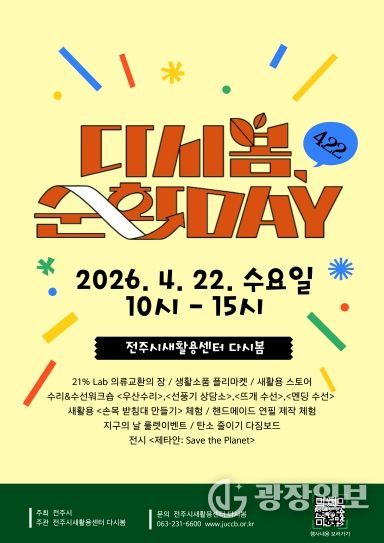광장일보 주재영 기자 | 전주시새활용센터 ‘다시봄’은 오는 22일 ‘지구의 날’을 맞아 의류 폐기물을 줄이고 자원 순환의 가치를 공유하는 ‘다시봄 순환 Day 4.22’ 행사를 개최한다.
