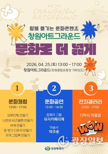 광장일보 주재영 기자 | 창원특례시는 완연한 봄을 맞아 시민 누구나 일상에서 다채로운문화예술을 즐길 수 있는 '창원아트그라운드, 문화로 더 넓게' 행사를 오는 4월 25일 토요일 창원종합운동장 지하보도에서 개최한다고 밝혔다.