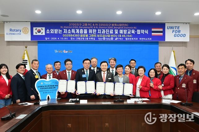 광장일보 주재영 기자 | 고령군과 국제로타리 3700지구 고령로타리클럽(회장 최유승)은 4월 15일, 고령군청에서 관내 저소득 취약계층의 구강 건강 증진을 위한 ‘치과진료 및 예방교육 사업’업무 협약을 체결했다.