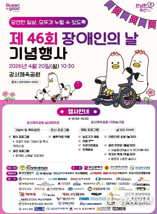 광장일보 주재영 기자 | 부산시는 오늘(20일) 오전 10시 30분, 강서체육공원 실내체육관에서 장애인에 대한 이해를 높이고 장애인과 비장애인이 함께 공감하는 장을 마련하기 위해 '제46회 장애인의 날 기념행사'를 개최한다고 밝혔다.