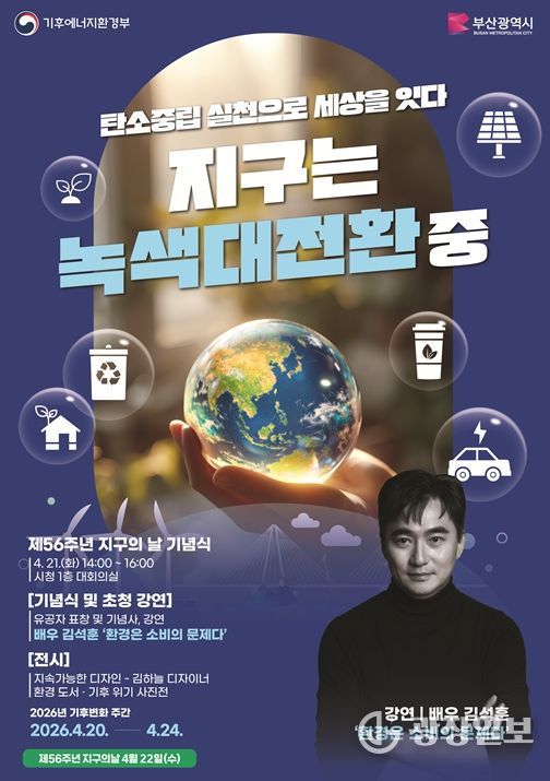 광장일보 주재영 기자 | 부산시는 '제56주년 지구의 날(4월 22일)'을 맞아 오늘(20일)부터 24일까지 '제18회 기후변화주간'을 운영하고, '지구는 녹색대전환 중. 탄소중립 실천으로 세상을 잇다'를 주제로 다양한 행사를 개최한다고 밝혔다.