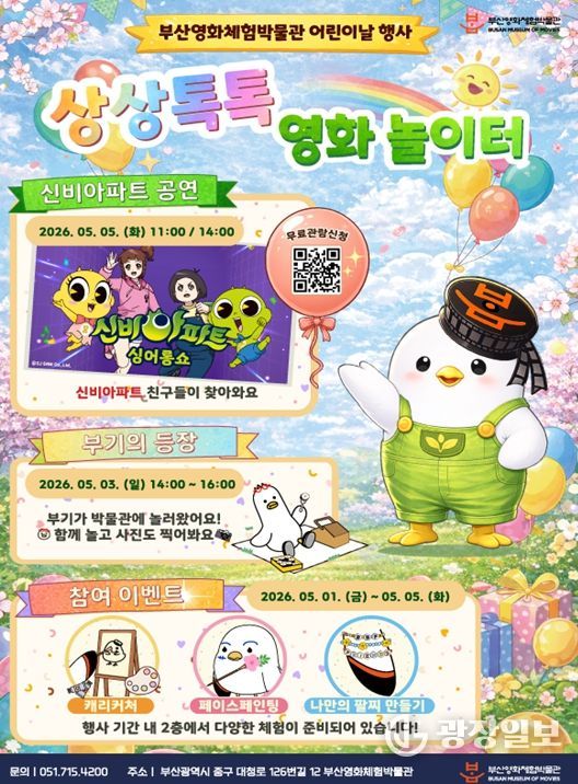 광장일보 주재영 기자 | 부산시는 부산영화체험박물관(관장 박채성, 중구 소재)에서 어린이날을 맞아 어린이와 가족 관람객을 위한 특별 행사 '상상톡톡 영화 놀이터 : 다 같이 놀자!'를 오는 5월 1일부터 5일까지 5일간 개최한다고 밝혔다.