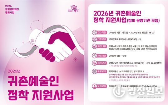 광장일보 이현나 기자 | 강원문화재단은 귀촌예술인의 안정적인 지역 정착과 지역문화 활성화를 위해 '2026년 귀촌예술인 정착 지원사업' 운영기관을 오는 5월 8일까지 공개 모집한다.