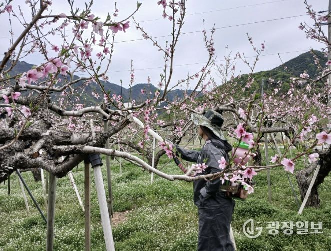 농업기술센터는 특히 중심화에 피해가 발생한 경우, 측화에 인공수분을 실시해 착과량을 확보하고, 적과 시기를 늦춰 최대한 열매 수를 유지하도록 지도하고 있다.