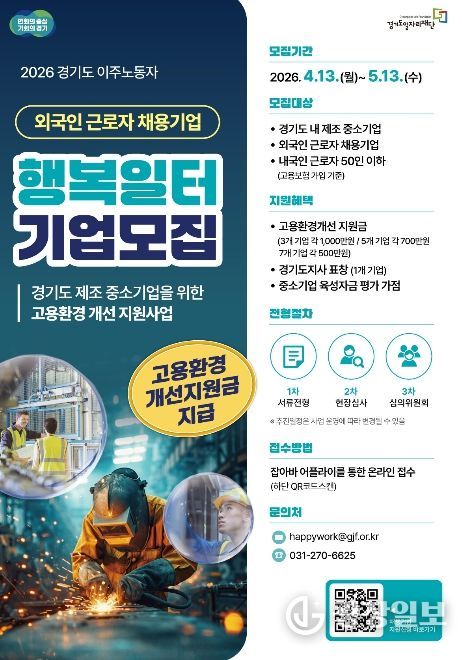 광장일보 박균현 기자 | 경기도와 경기도일자리재단은 도내 외국인 근로자를 고용한 중소 제조기업을 대상으로 ‘2026년 경기도 이주노동자 행복일터 선정사업’ 참여기업을 모집한다고 20일 밝혔다.