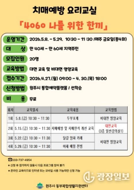 광장일보 이현나 기자 | 원주시 동부복합생활지원센터는 오는 27일부터 치매 예방을 위한 요리교실 ‘4060 나를 위한 한끼’ 참여자를 모집한다.
