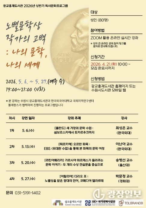 광장일보 박균현 기자 | 수원시 광교홍재도서관이 한국외국어대학교와 협력해 진행하는 2026년 세계문화기행 시리즈 1편 ‘노벨문학상 작가의 고백 : 나의 문학, 나의 세계’ 강좌를 수강할 시민을 모집한다.