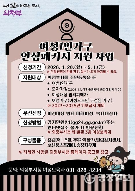 광장일보 주재영 기자 | 의정부시는 4월 20일부터 5월 1일까지 12일간 온․오프라인을 통해 여성 1인 가구 안심패키지 지원사업의 신청을 접수한다.
