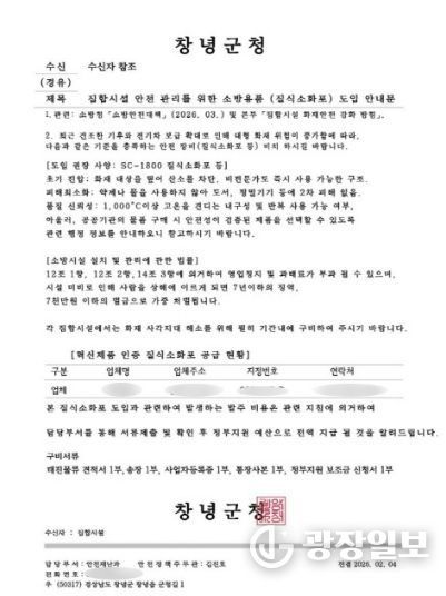 광장일보 주재영 기자 | 창녕군은 공무원을 사칭해 관내 장례식장에 소방용품(질식소화포) 구매를 요구하는 보이스피싱 사례가 발생했다고 밝혔다.