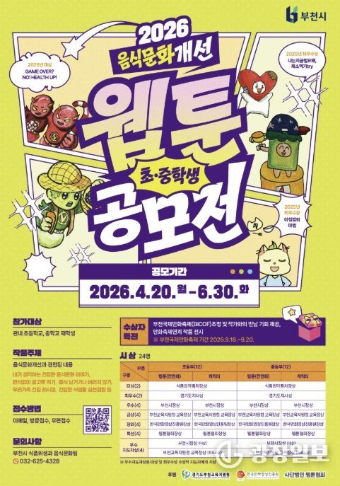 광장일보 주재영 기자 | 부천시는 4월 20일부터 6월 30일까지 ‘2026년 음식문화개선 초중학생 웹툰·캐릭터 공모전’을 연다. 이번 공모전은 학생들이 일상 속 음식문화를 주제로 직접 창작에 참여함으로써 올바른 식문화에 대한 인식을 높이기 위해 매년 추진되고 있다.