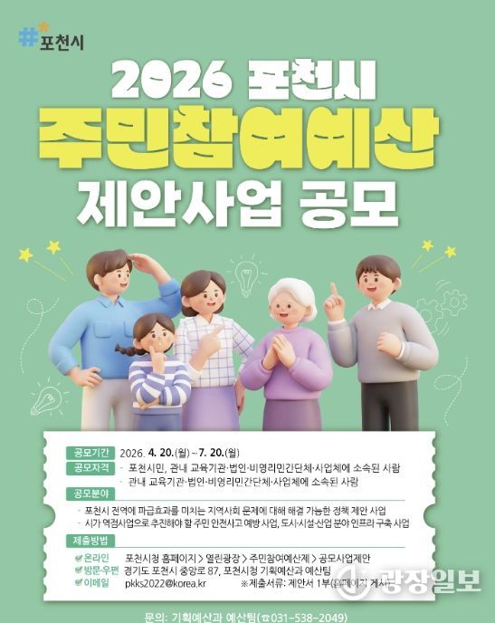 광장일보 주재영 기자 | 포천시가 4월 20일부터 오는 7월 20일까지 2027년도 예산편성을 위한 주민참여예산 공모제안사업을 접수하고 있다.