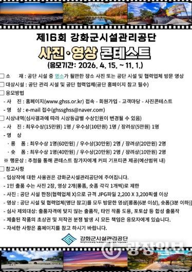 광장일보 주재영 기자 | 강화군시설관리공단이 ‘제16회 강화군시설관리공단 사진·영상 콘테스트’를 개최한다.
