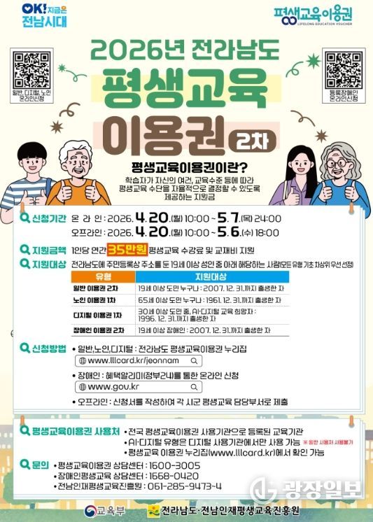 광장일보 주재영 기자 | 순천시는 시민의 평생학습 기회 확대와 교육격차 해소를 위해 ‘2026년 전라남도 평생교육이용권’ 2차 신청 접수를 20일부터 시작한다고 밝혔다.