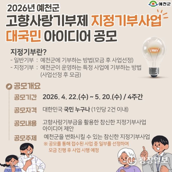 광장일보 주재영 기자 | 예천군은 기부자가 사업 목적에 공감하고 직접 수혜 대상을 결정하는 ‘고향사랑 지정기부제’를 적극 도입하기로 하고, 그 첫걸음으로 4월 22일부터 5월 20일까지 '2026년 예천군 고향사랑기부제 지정기부사업 아이디어 공모전'을 열어 국민들의 참신한 제안을 받는다.