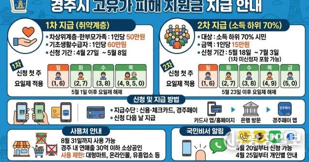지급수단은 신용·체크카드 또는 경주페이 카드 중 선택할 수 있으며, 신청 다음 날 지급된다.