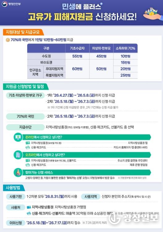 이어 2차 지급은 5월 18일부터 7월 3일까지 소득 하위 70% 군민을 대상으로 1인당 25만 원을 지급할 예정이며, 1차 기간에 신청하지 못한 대상자도 2차 기간에 추가로 신청할 수 있다.