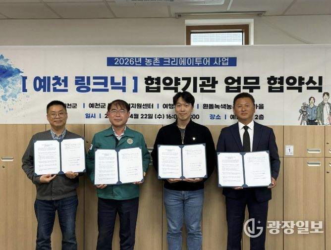 광장일보 주재영 기자 | 예천군은 지난 22일 오후 4시, ‘농촌 크리에이투어’ 사업의 체계적인 추진과 민·관 협력 강화를 위한 민간 협의체를 구성하고 업무 협약을 체결했다고 밝혔다.