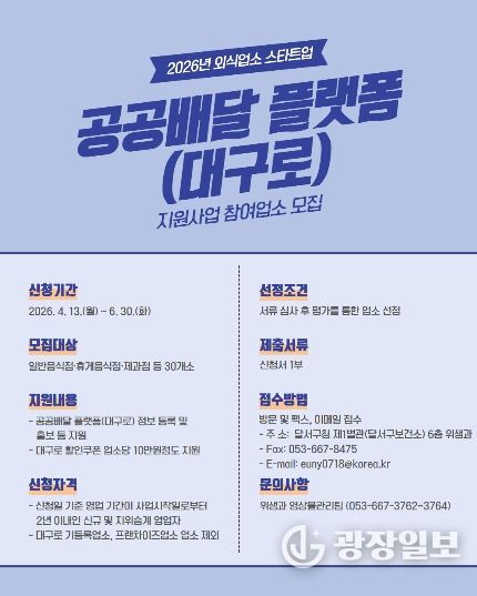 광장일보 주재영 기자 | 대구 달서구는 신규 외식업소의 조기 정착과 경영 안정화를 돕기 위해 ‘2026년 외식업소 스타트업 공공배달 플랫폼 지원사업’을 추진한다.