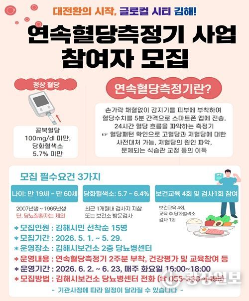 사업 참여자들에게는 2주분의 연속혈당측정기 부착, 총 5번에 걸친 관련 보건교육과 관련상담, 검진 등의 서비스가 제공된다. 문의는 김해시보건소 만성질환관리팀으로 하면 된다.