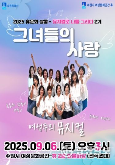 광장일보 나학천 기자 | 수원시 여성문화공간-휴(休)가 ‘뮤지컬로 나를 그리다’ 프로그램 참여자들이 출연하는 뮤지컬 ‘그녀들의 사랑’을 9월 6일 상연한다.