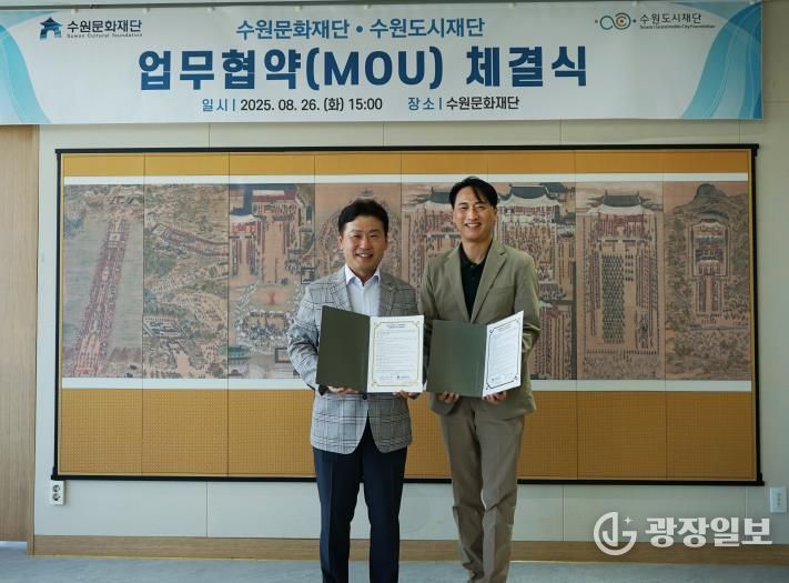 광장일보 나학천 기자 | 수원문화재단은 지난 26일 수원시의 문화예술 분야 상호발전 및 활성화를 위해 수원도시재단과 업무협약을 체결했다.