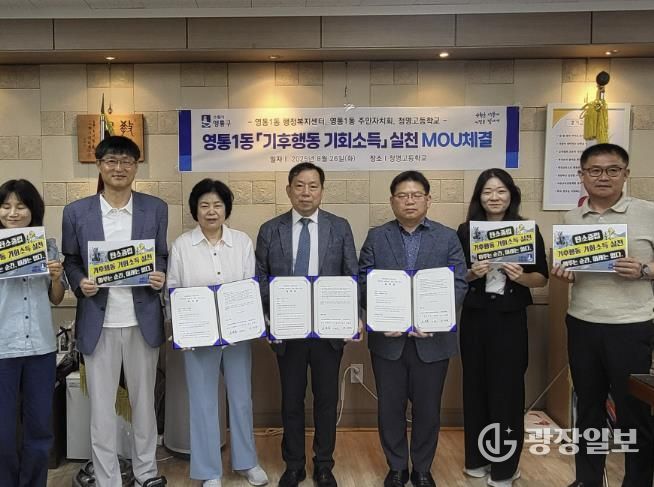 광장일보 나학천 기자 | 수원시 영통구 영통1동 행정복지센터와 주민자치회 그리고 청명고등학교는 기후변화 대응 및 기후소득 증진을 위한 양해각서(MOU)를 체결했다.