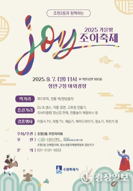 광장일보 나학천 기자 | 수원시 장안구 조원2동 주민자치회는 오는 7일 오전 11시부터 장안구청 앞 야외광장에서 '2025 가을빛 조이 축제'를 개최한다.