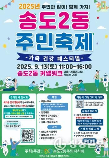 광장일보 주재영 기자 | 연수구 송도2동 주민자치회가 오는 13일 송도 커넬워크 겨울동에서 가을동 사이 차 없는 거리에서 '2025 송도2동 주민축제'를 개최한다.