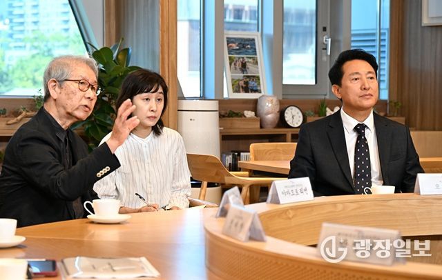 광장일보 주리아 기자 | 오세훈 서울시장은 10일 오전 11시 20분 집무실에서 ‘2024 프리츠커상’을 수상한 일본인 건축가 야마모토 리켄(山本理顕)을 만나 ‘서울시민을 위한 미래 주거공간’에 대한 프레젠테이션을 청취하고 저출생‧고령화 사회 속 공동주택의 역할과 미래에 대해 이야기 나눴다.