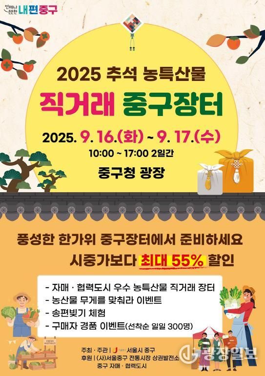 광장일보 주리아 기자 | 서울 중구가 추석을 앞두고 오는 16일과 17일 양일간 중구청 앞 광장에서 오전 10시부터 오후 5시까지 직거래 장터를 운영한다.