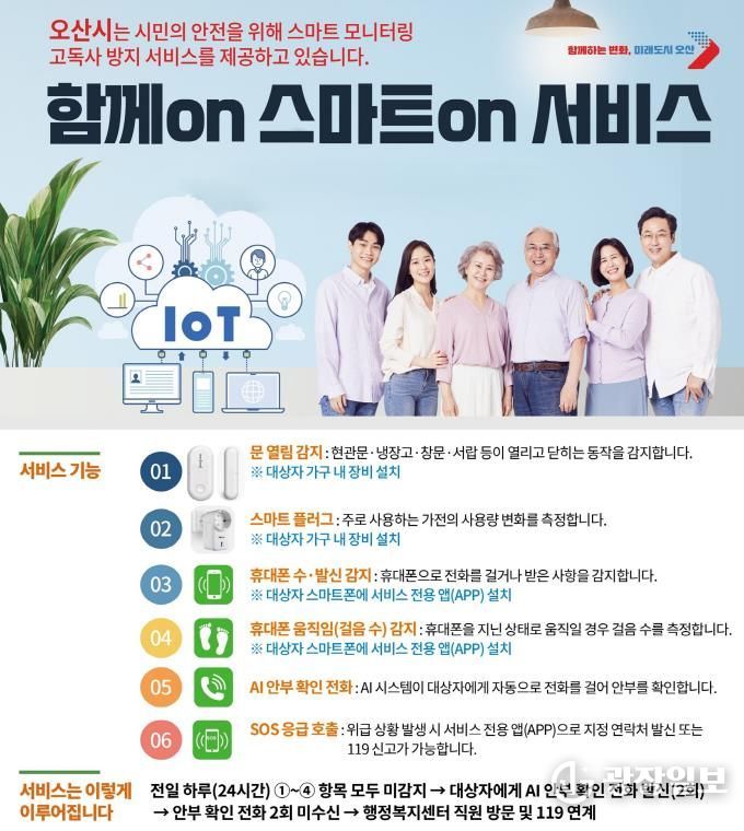 광장일보 나병석 기자 | 오산시는 9월부터 관내 고독사 위험 시민들의 사회적 고립을 해소하고 고독사 예방을 위해 사물인터넷(IoT) 기반 디지털 모니터링 서비스인 ‘함께on 스마트on 서비스’를 운영한다고 밝혔다.