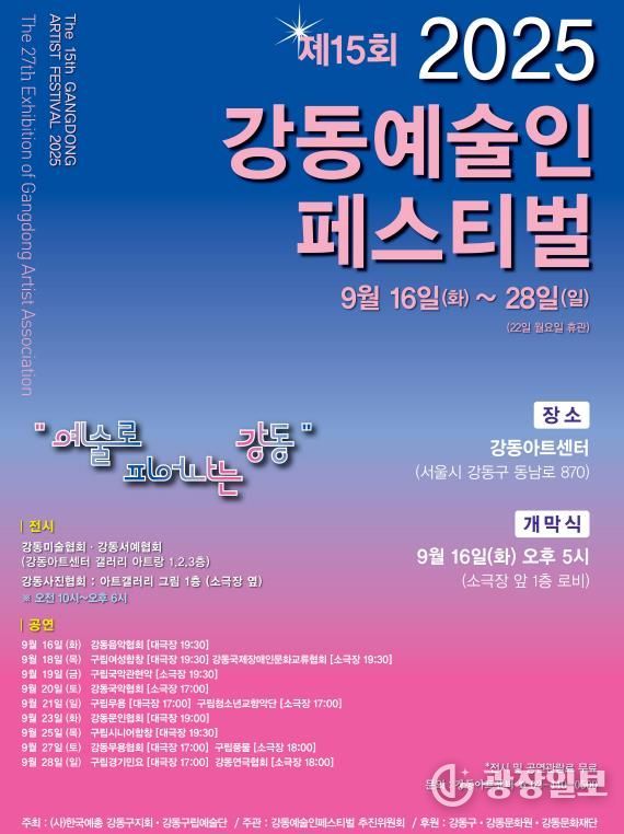 이수희 강동구청장은 “올해로 15회를 맞은 강동예술인 페스티벌은 강동이 가진 문화적 저력을 보여주는 대표적인 행사”라며 “앞으로도 지역 예술인의 창작 활동을 꾸준히 지원하고, 강동예술인 페스티벌을 주민과 함께하는 열린 축제로 더욱 발전시켜 나가겠다”고 말했다.