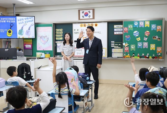 1학년 교실을 찾은 오 시장은 어린이들을 대상으로 ‘초등안심벨’ 사용법을 직접 알려주며 “등하굣길 조금이라도 무섭거나 이상한 느낌이 들면 망설이지 말고 누르면 된다”고 설명했다.