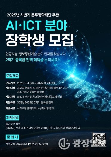 서초구 양재·우면동 일대가 지난해 과학기술정보통신부로부터 ‘AI 특구’로 지정되며 국가 AI 경쟁력을 좌우할 핵심 거점으로 주목받고 있다. 이에 구는 지역 학생들이 미래산업 분야에서 역량을 발휘할 수 있도록 지원을 확대해 나가고 있다. 문주장학재단에서 주관하는 이번 장학생 모집은 지역 내 AI·ICT 분야 핵심 인재를 발굴하고 육성하기 위한 구의 노력에 재단이 힘을 보태며 마련됐다.