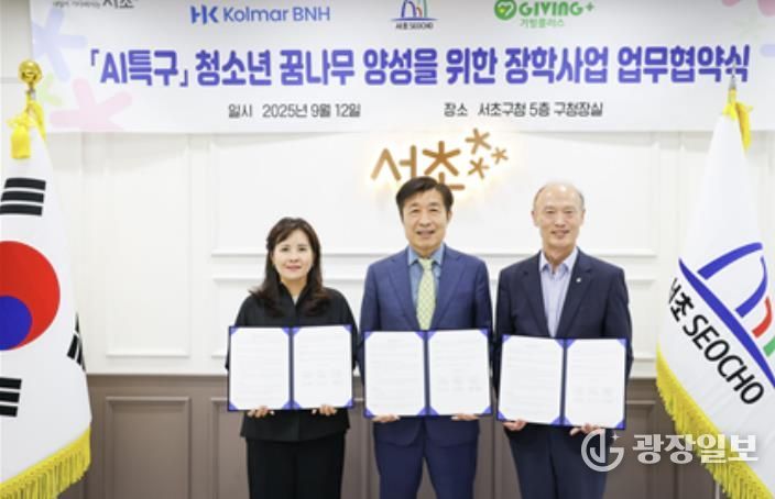 광장일보 주리아 기자 | 서울 서초구는 지난 12일, 국내 대표 건강기능식품 연구개발생산 기업 콜마비앤에이치, 재단법인 기빙플러스와 함께 ‘AI특구 청소년 꿈나무 양성을 위한 장학사업’ 업무협약을 체결했다고 밝혔다.