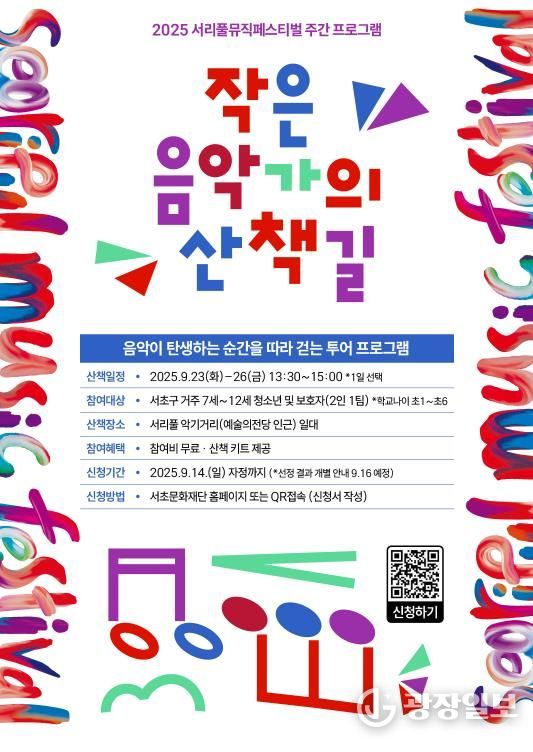 9월 23일~26일, 서리풀 악기거리에서는 음악가의 일상과 공간을 체험하는 도보형 프로그램 ‘작은 음악가의 산책길’이 진행된다. 예술의전당 무대 탐방을 시작으로 서리풀아트스튜디오, 악기 공방, 클래식 연습실 등을 둘러보며 음악이 만들어지는 과정을 가까이에서 경험하고, 악기 장인과 연주자의 이야기를 직접 들을 수 있다. 주민들의 뜨거운 반응으로 모집은 마감됐으며, 선정 결과는 16)에 개별적으로 안내될 예정이다.