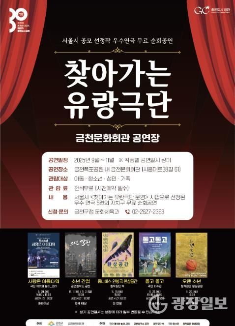 광장일보 주리아 기자 | 금천구는 9월 20일부터 11월 29일까지 금천문화회관에서 ‘2025 찾아가는 유랑극단’ 사업으로 선정된 우수연극 5편을 무료로 선보인다고 밝혔다.