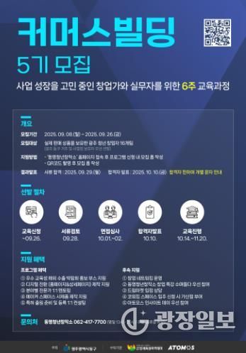 광장일보 주재영 기자 | 광주 동구는 창업 아이템을 보유한 청년 창업자를 대상으로 오는 26일까지 ‘커머스빌딩 5기’ 교육생을 모집한다고 밝혔다.