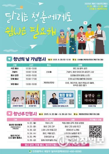 광장일보 주재영 기자 | 인천광역시 계양구는 청년의 날(9월 셋째 주 토요일)을 맞아, 오는 9월 20일부터 26일까지 청년주간행사를 운영한다고 밝혔다.