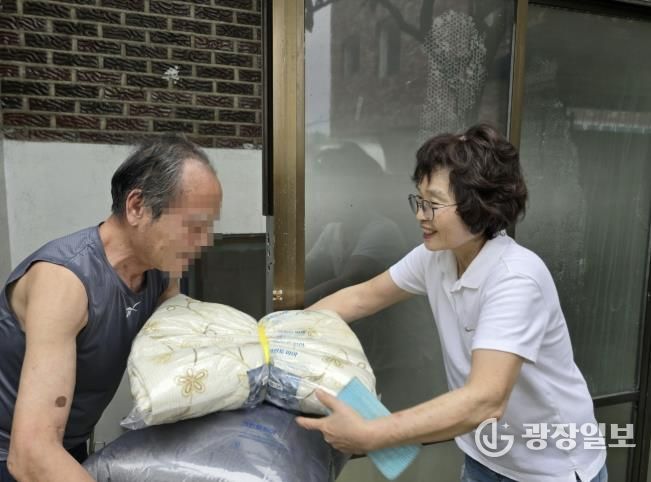 세탁된 이불 빨래를 전달받은 어르신은 “몸이 여기저기 아프고 빨래도 하지 못했는데 동에서 이런 도움을 주니 정말 감사하다.”라고 말했다.