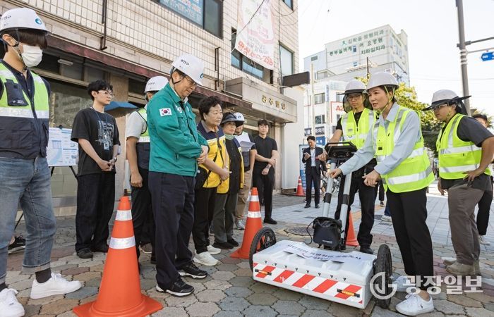 이날 현장에는 김경호 구청장을 비롯해 관계 부서 공무원, 전문가, 주민들이 함께 참여해 장비의 실제 작동 과정을 직접 확인했다. 지표투과레이더(GPR) 장비는 전자파를 이용해 지하 2m 이내의 구조물, 공동, 매설물을 비파괴 방식으로 탐지할 수 있어, 도로 함몰과 같은 지반침하 사고를 사전에 예방하는 데 효과적인 최첨단 장비다.
