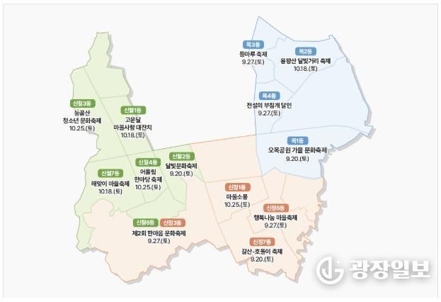 오는 20일에는 ▲목1동 ‘오목공원 가을 문화축제’ ▲신월2동 ‘달빛문화 축제’ ▲신정7동 ‘갈산·호돌이 축제’가 열리며, 본격적인 동 축제가 시작된다.