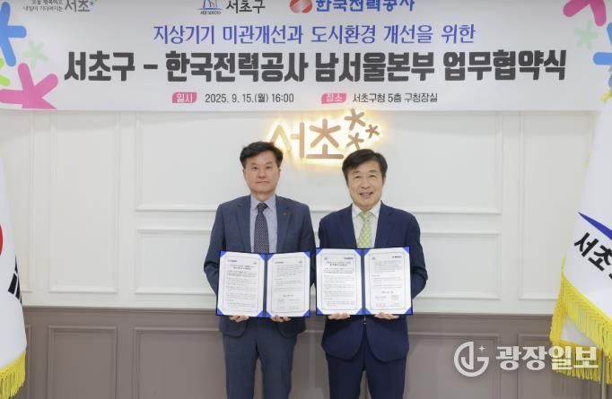 광장일보 주리아 기자 | 서울 서초구가 15일 서초구청에서 한국전력 남서울본부와 ‘지상기기 미관 개선과 도시환경 개선을 위한 업무협약’을 체결했다고 밝혔다. 이번 협약은 두 기관이 상호 협력하여 서초구 공공보도상 지상기기 정비를 통해 도시환경을 개선하고 쾌적한 보행환경을 만들기 위해 추진됐다.